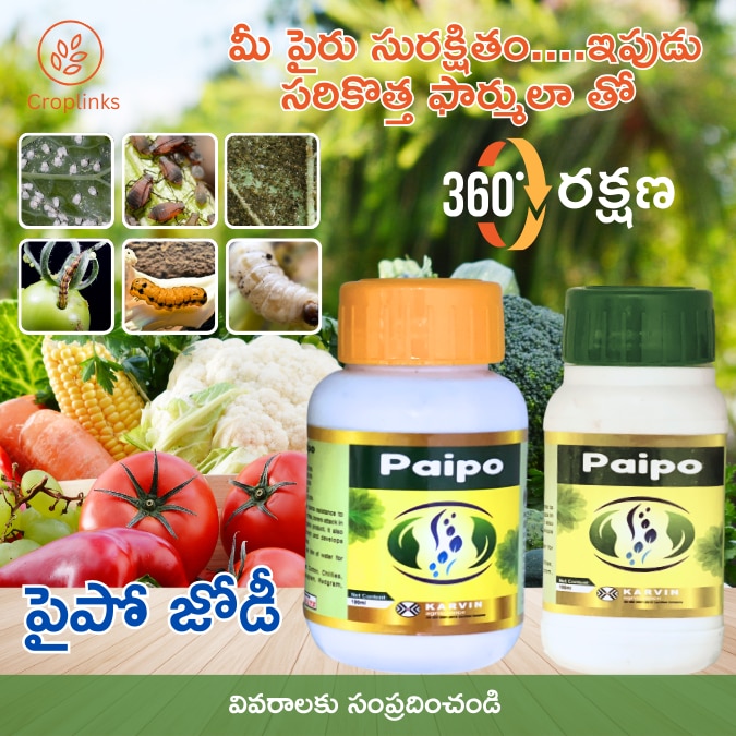 PAIPO helps to improve plants resistance to face insects like Thrips, mites, borers attack in crops. PAIPO isa natural organic product. PAIPO Helps in vigorous growth and Develops resistance for higher Yields. Dosage : 0.5-0.75 ml per Litre of water for uniform foliage coverage. Recommended Crops : Cotton, Chillies, Tomatos, Bhendi, Blackgram, Redgrams, Vegetables. etc.