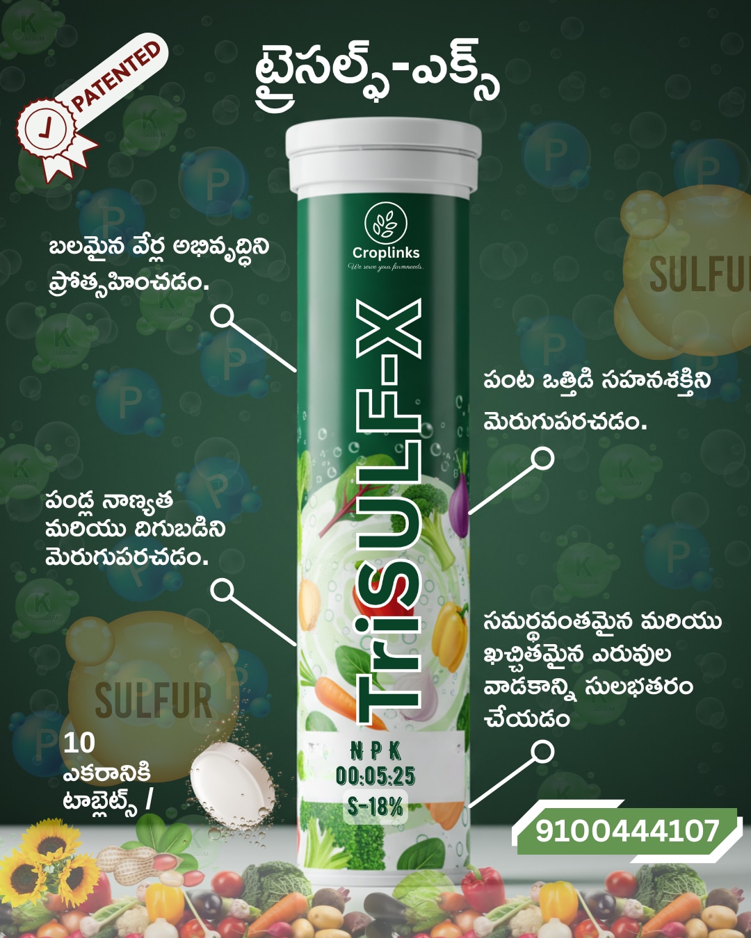 Grow Better, Harvest More with BioSulf Product Overview: TRISULF-X : is an effervescent tablet with 5% phosphorus, 25% potassium, and 18% sulfur, designed to enhance root growth, fruit quality, and plant resilience. It ensures healthier crops, better yields, and sustainable farming. Key Benefits: ► Root Growth – Strengthens root systems for better nutrient and water uptake. ► Fruit Quality – Improves size, color, sweetness, and overall yield. ► Plant Resilience – Enhances tolerance to environmental stresses. Direction for Use: Drop 1 tablet in a knapsack sprayer (15-20 liters of water) For soil application Use 20 tabs/acre for Vegetable Crops & 30 Tabs/Acre for Horticulture Crops.